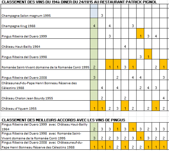 Le vote du consensus serait : 1 – Château d’Yquem 1955, 2 – Romanée Saint-Vivant domaine de la Romanée Conti 1995 , 3 – Pingus Ribeira del Duero 2008, 4 – Pingus Ribeira del Duero 1999, 5 – Châteauneuf-du-Pape Henri Bonneau Réserve des Célestins 1988.