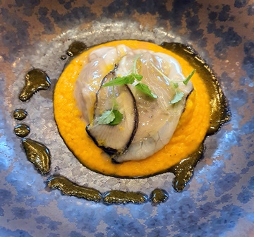 Le Champagne Dom Pérignon P2 2002 est un champagne absolument superbe et épanoui, combinant sérénité et jeunesse. L’accord avec la carotte est particulièrement osé, mais il est réussi et l’imposante huître n° 1 est parfaite pour ce beau champagne.