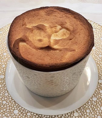 Le Château Guiraud Sauternes 1893 est d’une bouteille ancienne superbe, n’a pas d’étiquette mais la capsule et le bouchon renseignaient sur son nom et sur son année. Le niveau dans la bouteille était presque dans le goulot. Sa couleur est plutôt claire, tendant vers le rose. Son parfum est infini. On peut dire que c’est un sauternes parfait, d’une année mythique. Le soufflé est absolument divin. Un détail est amusant. Lorsque j’étais venu il y a une semaine vérifier certains plats avec le chef, j’avais eu l’opportunité de goûter cet excellent soufflé. Mais il était copieux. Aussi avais-je demandé au chef de réduire la taille du soufflé. Ce qui fut fait. Mais un des convives ayant adoré ce plat a demandé s’il pouvait en avoir un peu plus et toute la table a eu un deuxième service du soufflé. Le chef avait donc vu juste lors de mon essai. L’accord Guiraud et soufflé est divin.