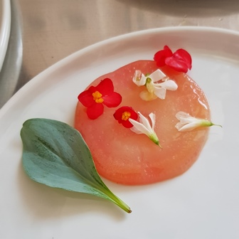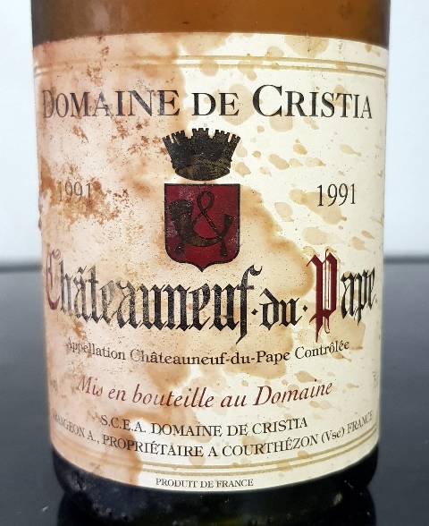 Nous passons à table et sur des langoustines accompagnées de betteraves blanches, de fleurs comestibles et d’une huile d’olive parfumée à la mandarine, je sers le Châteauneuf-du-Pape Domaine de Cristia 1991 que j’annonce madérisé. Par rapport à ce que j’avais senti à l’ouverture, le vin a fait de réels progrès parce qu’il serait buvable, mais nous n’insistons pas.