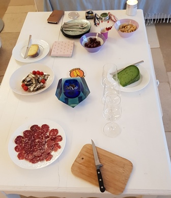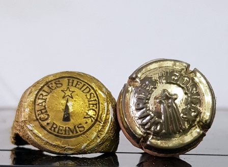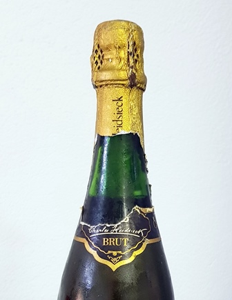 Les amis arrivent au quatrième top de 20 heures. L’apéritif va consister en de petites sardines, des tranches de saucisson, des olives noires, une délicieuse anchoïade, des petits biscuits italiens au poivre noir, un gouda à la truffe et un gouda au pesto. Le Champagne Charles Heidsieck Brut sans année doit être des années 70. Au moment de relever le bouchon qui vient entier, des petites bulles éclataient le long du bouchon, signe que le pétillant est bien là. La couleur est ambrée, la bulle quasi inexistante. C’est un champagne ancien, doucereux, au joli fruit brun, mais dont le message est trop monocorde. Il est agréable et cohabite bien avec les saveurs variées de l’apéritif, mais il lui manque un peu de vivacité et d’émotion.