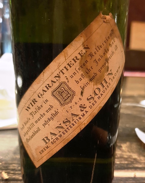 J’arrive ensuite vers 9h30 au Sergent Recruteur pour ouvrir les vins du déjeuner. Le Corton Grèves 1919 a été certainement reconditionné puisque l’étiquette porte « appellation contrôlée » mention qui n’existait pas à cette époque. Je pensais à un rebouchage du domaine Louis Latour dans les années soixante, mais le bouchon est venu en tellement de morceaux que le rebouchage est sans doute plus ancien. Le plus beau des bouchons est celui du Rota 1858, tout petit, d’un liège exceptionnel, la bouteille n’ayant rien perdu de son volume en 163 ans. Tous les parfums sont parfaits les plus beaux étant celui du Rota 1858, du Bâtard-Montrachet 1990 et du Porto 1872. Je fais sentir les vins à Norman le sommelier et à Benjamin chef de salle. J’ai apporté en cuisine le Rota 1858 et le Porto 1872 afin que le chef et son équipe voient comment orienter les sauces et les saveurs en fonction de ce qu’ils sentent.