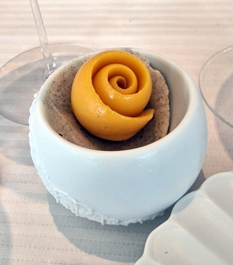 Le Champagne Krug Clos du Mesnil 1983 montre immédiatement qu’il est plus complexe et plus fin. C’est une autre version du champagne noble. Mais je trouve qu’il manque un peu d’émotion comme un acteur qui récite son texte sans trop de passion. C’est évidemment un grand champagne mais pas au niveau qu’il devrait avoir, comme le démontrera le vin qui suit. La tartelette est un pur régal qui cohabite le mieux avec le Dom Pérignon pour le caviar et le poisson cru alors que le jaune d’œuf avec le caviar trouve un bel écho avec le Krug.