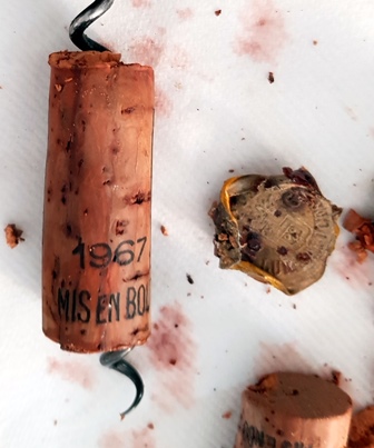 The bottle of Meursault Faiveley Négociant 1959 is made of blue glass like the bottles from the years of the Second World War. I do not think it is a reuse. The level is very high. The cap is of good quality. I smell the bottleneck and a terrible cork odor is unbearable. Out of curiosity, I smell the cork and the surprise is great, because the cork absolutely does not smell like the cork. How is it possible? I smell several times to confirm my impressions.