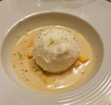 La cuisine du chef est très talentueuse. Notre table est une corne d’abondance où chaque serveur vient ajouter de nouvelles saveurs au plat déposé devant nous. Ça n’arrête pas et je pense que cette forme de cuisine où la surenchère d’accompagnements est sans fin connaîtra un frein lorsque le pouvoir tyrannique du Guide Michelin s’affaiblira. Ce qui n’empêche pas que nous ayons apprécié la cuisine imaginative et talentueuse du chef.