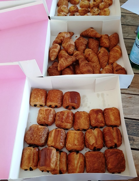 Tout est fini de mon côté et la salle du restaurant est en pleine mise en place. On sent que les gestes sont précis et les méthodes rodées. On surveille la météo qui annonce que la pluie pourrait cesser vers 11 heures ou 11h30 ce qui pourrait permettre, si on essore les tables et le carrelage, de prendre l’apéritif sur la terrasse. Ce sera le cas.