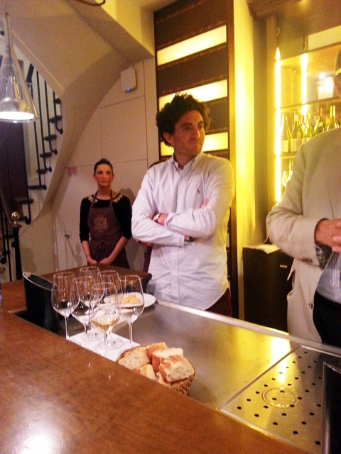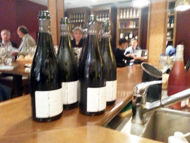Etant sur les lieux bien avant l’heure du rendez-vous, je fais un crochet par les Caves Legrand où je rencontre la présidente de Krug, attablée dans la galerie Vivienne, qui travaille avec une collaboratrice. On leur apporte un Champagne Krug Grande Cuvée qui doit être celui d’un anniversaire de la maison Krug et je suis aimablement invité à trinquer avec elles. Le champagne est d’une aisance et d’un naturel confondants. C’est la noblesse dans l’accessibilité et c’est un très grand champagne. Je laisse les deux travailleuses et je finis de boire mon verre au comptoir du bar des Caves Legrand. Ce comptoir est le point de rencontre de tous les amateurs de vins. Ainsi, deux personnes qui dégustent un Champagne Jacquesson Cuvée 739 fait à 70% d’une base de 2011 et avec 57% de chardonnay me proposent d’y goûter. J’ai relativement peu de repères pour les champagnes Jacquesson mais celui-ci me paraît direct, droit, précis et vif et agréable à boire, même s’il est moins accueillant que le Krug.
