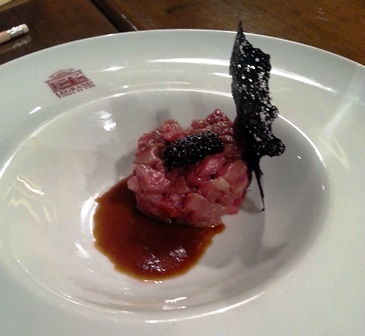 Le menu est plus un support que le fruit d’une recherche d’accords. J’ai pris dans les choix possibles un tartare de bœuf avec cœur d’artichaut et truffe / ravioli de langoustine / daurade avec un risotto noir et champignons / tarte au citron. La cuisine est agréable mais notre intérêt est ailleurs.