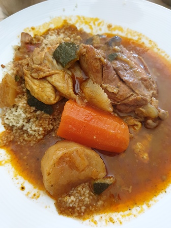 Ne sachant pas si le rosé serait bon, j’avais ouvert il y a plus de trois heures un Vin de F. Sénéclauze Saint-Eugène Oran 1953. Ce vin titre 13°. Son niveau dans la bouteille était parfait. Le bouchon s’est brisé en morceaux mais sans problème. Le premier nez m’a rebuté mais ce fut fugace, le parfum revenant dans des odeurs cohérentes. Lors du service dans les verres, la couleur du vin est d’un rouge sang très jeune. Le nez est intense et franc. En bouche on n’a pas les goûts intenses des vins des côtes de Mascara mais on a un vin ensoleillé, franc, simple et gouleyant. Le vin est beaucoup moins adapté au couscous que le rosé. Il prend sa revanche avec les fromages notamment avec un camembert et avec un chèvre délicieux.