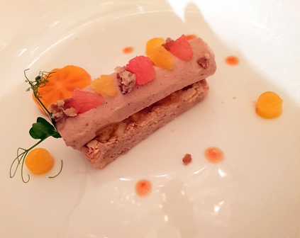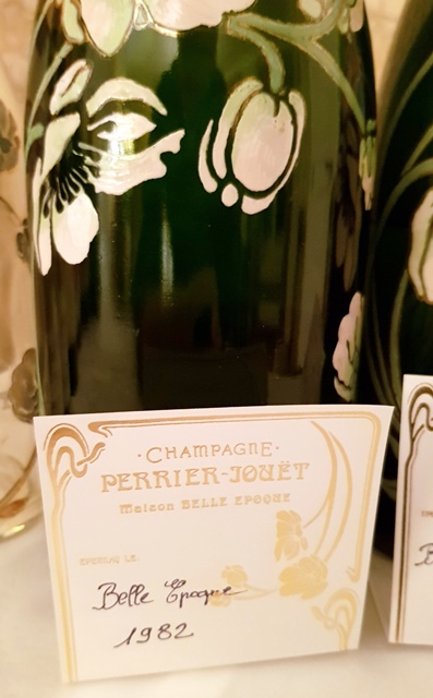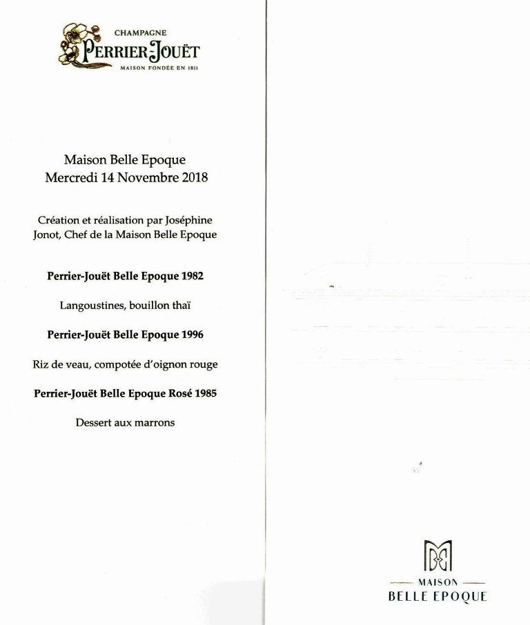 Sur le dessert nous buvons un Champagne Perrier-Jouët Belle Epoque rosé magnum 1985. Il convient bien au dessert, il est très agréable, mais il n’a pas la force de conviction des deux blancs.