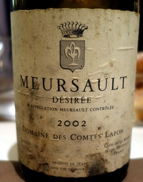 Le Meursault Désirée Domaine des Comtes Lafon 2002 est très agréable, hospitalier, gourmand avec une jolie vibration du fruit. Ce n’est pas un cru classé mais c’est un vin de plaisir bu en l’honneur de Christian, participant habituel de ces dîners et qui apportait quasi systématiquement des vins des comtes Lafon et n’a pas pu être présent.