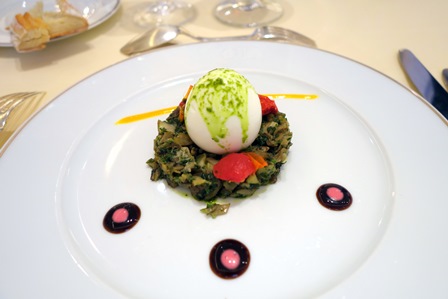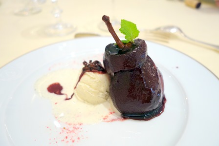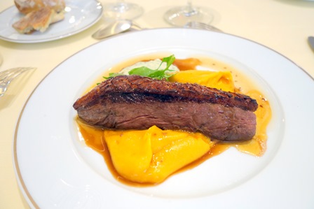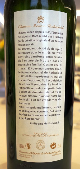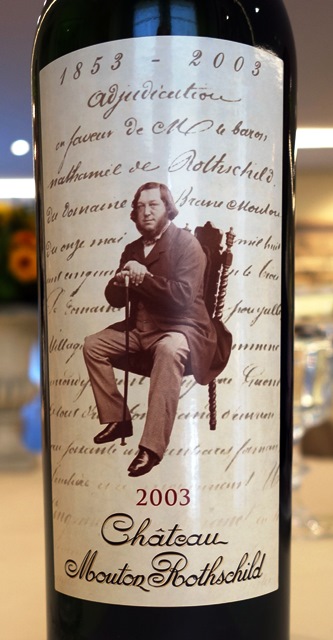 Nous prenons une coupe de Champagne Pol Roger fort agréable, le temps de consulter la carte des vins qui n’a pas l’opulence du lieu. La salle à manger est à l’étage ou plutôt à mi- étage car le plafond y est bas. Cela n’empêche pas que la table soit raffinée. Le menu est d’un œuf mollet posé sur des petits légumes, suivi d’un magret de canard et purée de potimarron et d’un dessert à la poire. C’est une cuisine simple, sans recherche de complication, mais la sauce du magret n’ajoutait rien au plat et jouait même hors sujet. Il est toujours délicat de choisir le vin lorsque l’on est invité, mais j’ai senti que mes hôtes accepteraient ma proposition. Ils ont eu raison car le Château Mouton-Rothschild 2003 est particulièrement bon. Ce qui me frappe, c’est le grain de ce vin. Il a une belle mâche lourde, le vin est dense, et c’est comme si l’on croquait de la truffe. Profond, noble, riche, il conquiert nos cœurs et sa longueur est quasi inextinguible. C’est un grand vin de Bordeaux, dont j’aurais du mal à estimer la longévité, car tel qu’il est, on aimerait qu’il ne vieillisse pas.