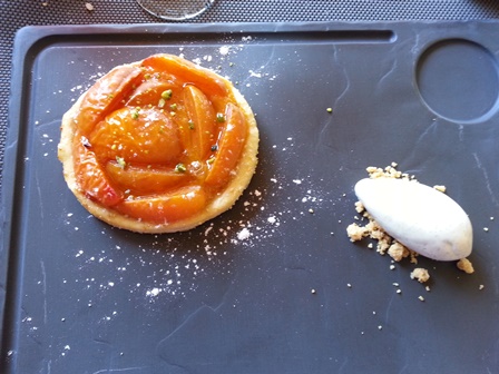 Nous commençons le déjeuner par une tartelette façon pizza avec un râpé de truffe de Richerenches absolument délicieuse qui excite bien le champagne. Je prends ensuite une pièce d’agneau du boucher avec une ratatouille de légumes. Tout cela est bien exécuté et gourmand. Lorsque le 2005 est fini, je demande que l’on apporte un Champagne Dom Pérignon 2004 que je connais beaucoup mieux. La différence est plus que sensible. Il y a dans le 2004 un beau fruit, une belle énergie et une belle mâche. On le boit avec gourmandise. Sur une tarte aux abricots de Riboux et sa glace vanille, on se sent bien.