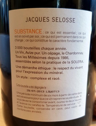 J’ouvre la bouteille que j’avais prévue pour l’atelier, un Champagne Substance Jacques Selosse dégorgé le 29 juillet 2013. Mes voisins de table en profitent et sont comme moi conquis par l’invraisemblable tension de ce champagne. Il est vif, il est conquérant, mais il est capable d’être insolent au point d’offrir un fruit calme, aussi bien rouge que jaune. Un régal.