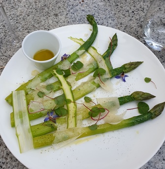 Tandis que la terrasse est très classique, remarquable surtout par la vue, la décoration intérieure est aussi monumentale que le musée avec des hauteurs sous plafond irréelles. La carte est simple mais bien conçue et mon menu sera : premières asperges vertes, parmesan 24 mois, huile d’olive bio / cabillaud façon black cod, riz au jasmin / glaces variées. Il n’y a pas de carte des vins et l’on prend des vins au verre. Etant seul à boire j’ai pris des verres de Champagne Charles Heidsieck brut sans année qui est très agréable à boire et très consensuel. On ne vient pas ici pour une expérience gastronomique, même si ce qu’on mange est bon, mais surtout pour profiter d’un lieu magiquement placé quand il fait beau.