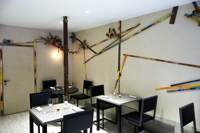 Le lieu est petit, la décoration est minimaliste. On dirait que l’on a jeté sur le murs des bâtonnets géants de Mikado. Ce n’est pas laid, mais c’est assez brouillon. Lorsque j’entre, le responsable de salle, Simon Thibaut, me dit : « bonjour M. Audouze ». ça fait plaisir d’être reconnu et de plus cela permet de discuter de façon plus ouverte. La carte des vins est composée de vins nature, mais surtout très jeunes aussi mon choix sera-t-il d’un verre de Champagne brut nature André Beaufort 2010. Le dernier vin que j’ai bu étant un sublime magnum de Veuve Clicquot 1947, il faut une certaine souplesse d’échine pour s’adapter à celui-ci. Je ne le jugerai pas, mais ce n’est pas le sens de mes recherches, surtout du fait de son âge.