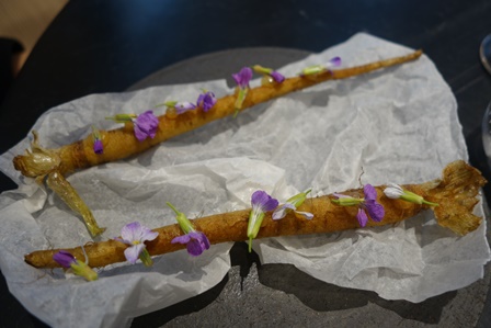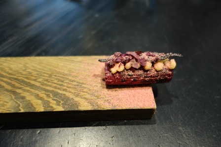 Le menu choisi est : poireau et beurre noisette / salsifis et fleurs / bulot et navet / foie gras, poivre long, meringue /camouflage de chinchard, genièvre et persil / rouget, romanesco, coques / bœuf et betteraves / myrtilles, Hinoki / piment de Jamaïque.
