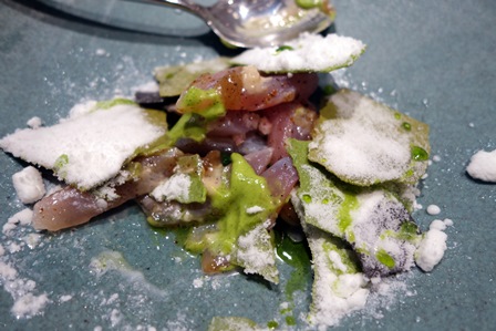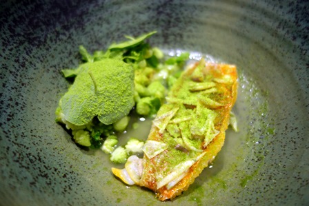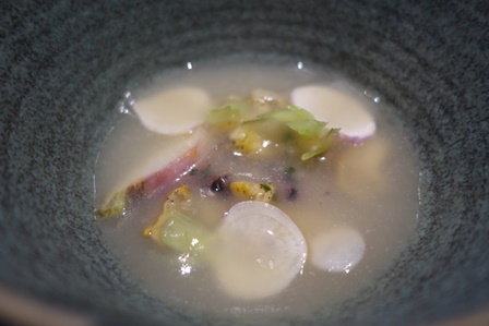 Voici quelques impressions au fil du repas : le poireau est trop ferme, la saveur serait plus raffinée sur le cœur tendre du poireau. La recherche de saveur est raffinée. Le salsifis est croquant, de belle mâche, c’est agréable. Le fait que l’on mange avec les doigts ces deux entrées alors qu’il y a des crèmes ne me plait pas trop. Les bulots sont très fermes. L’association avec les navets est pertinente, la sauce n’apporte rien. L’approche du plat de foie gras est très originale et commence par un camouflage. Les lamelles de meringues sont comme de la porcelaine brisée et recouvrent le foie. Le foie est bon, mais trop suapoudré de poivre. La meringue est délicieuse et suffisamment légère pour ne pas étouffer le foie.