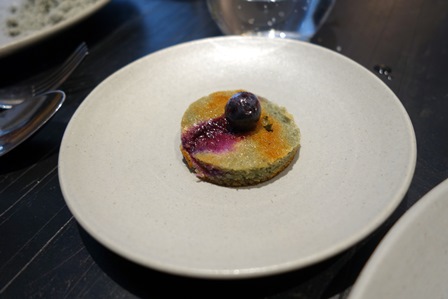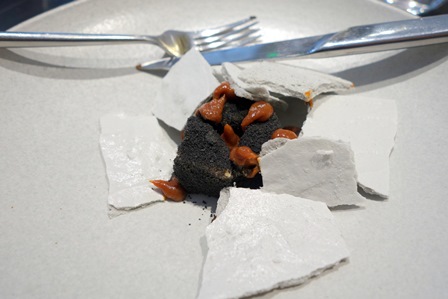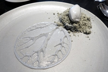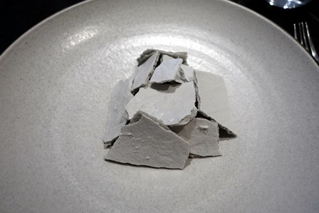 La présentation du dessert est graphiquement assez phénoménale. Le chef est un artiste graphique. Tous les tons du dessert sont de gris clair. Le plat est bon, mais on constate une dominante dans cette cuisine : elle est graphique, avec talent et elle est plus intellectuelle que goûteuse.
