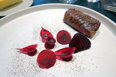 Le camouflage du chinchard est très original, comme si le poisson était placé sous des morceaux de carton déchirés, noyés sous une neige. On entre enfin dans un plat à la fois goûteux et talentueux. Ce sera le plus beau plat du repas. Le rouget manque un peu d’âme. Je l’aurais aimé plus vibrant. Le bœuf est superbement goûteux, de bonne mâche et la betterave s’accorde bien.