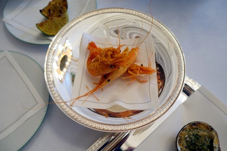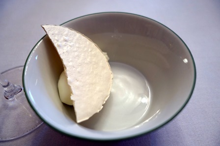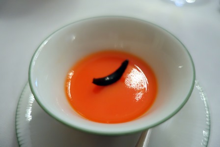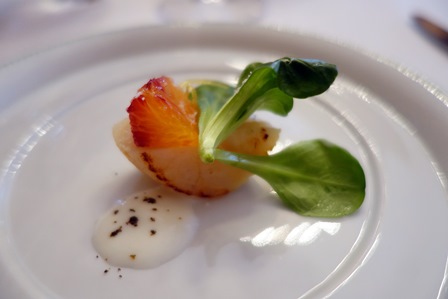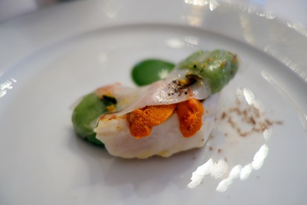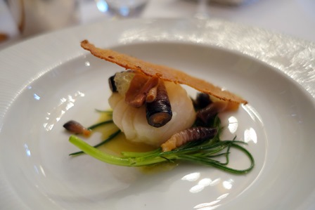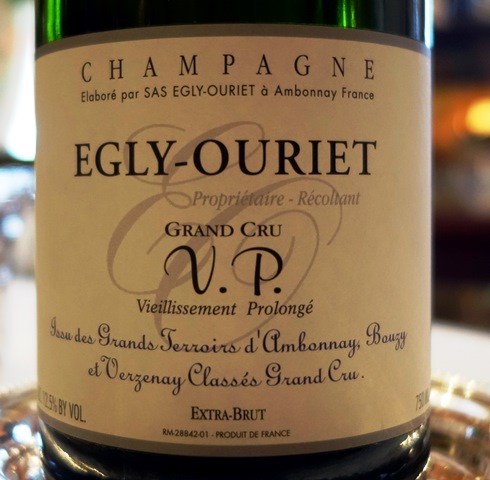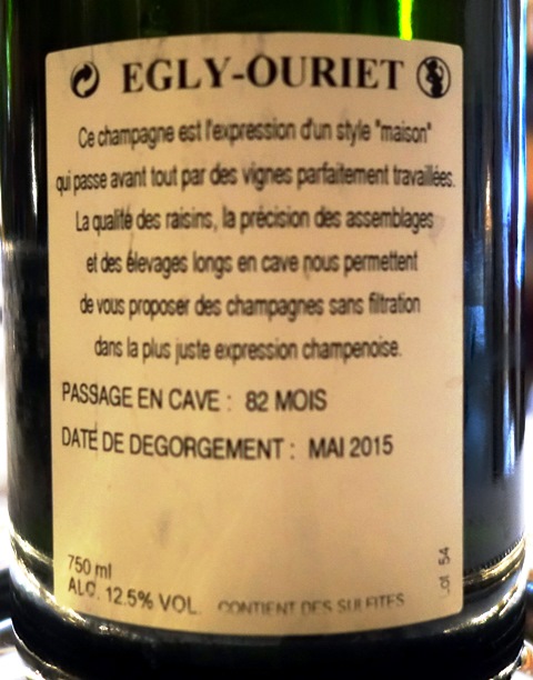 Le Champagne Egly-Ouriet Grand Cru V.P. vieillissement prolongé Extra Brut sans année qui a passé 82 mois en cave et a été dégorgé en mai 2015 a une attaque qui combine le floral et de jolis fruits roses. Cette attaque m’émeut. C’est un vin très élégant et ce n’est que progressivement que le caractère vif et vineux s’installe et lui donne une force gastronomique certaine. C’est avec le saint-pierre et l’oursin qu’il s’est montré le plus brillant. Comme nous étions à déjeuner et seulement deux nous n’avons pas pris d’autre vin car en plus Antoine pour nous faire patienter avant l’arrivée du champagne nous avait offert une verre d’Egly-Ouriet Brut très franc et direct mais moins complexe que celui qui a suivi.