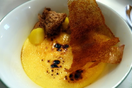 Le chef Christophe Pelé a du talent. Les cuissons sont exactes, les produits sont bons. Les ajoutes de goûts dans les plats ne sont pas ce que je recherche. Ainsi le pousse-pied n’apporte pas grand-chose au merlu, la langue d’oursin n’ajoute rien au saint-pierre. A l’inverse l’endive caramélisée apporte beaucoup au délicieux canard. Je pense aux vins anciens quand je fais cette analyse et je peux comprendre que l’on aime cette cuisine. Il faudrait sans doute aussi qu’elle soit un peu plus gourmande, ce que l’on retrouve dans les desserts superbes aux goûts cohérents.