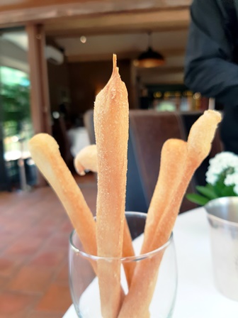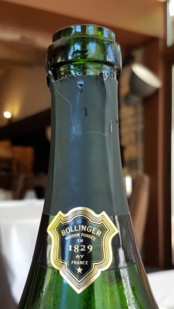 Jean-Marc, le mari de Valérie, qui fait office de directeur de salle et de sommelier, m’annonce avoir reçu des Bollinger Grande Année 2005 qu’il préfère au 2004. Nous allons donc prendre l’apéritif avec le Champagne Bollinger Grande Année 2005 qui est infiniment plus passionnant que le 2004. Il a une richesse, une plénitude et une émotion qui le placent très haut dans la hiérarchie de ce champagne Grande Année. Le jambon ibérique est toujours aussi intensément goûteux, les petites olives dénoyautées se mangent comme des bonbons et les gressins sont frais et légers. Tout commence parfaitement.