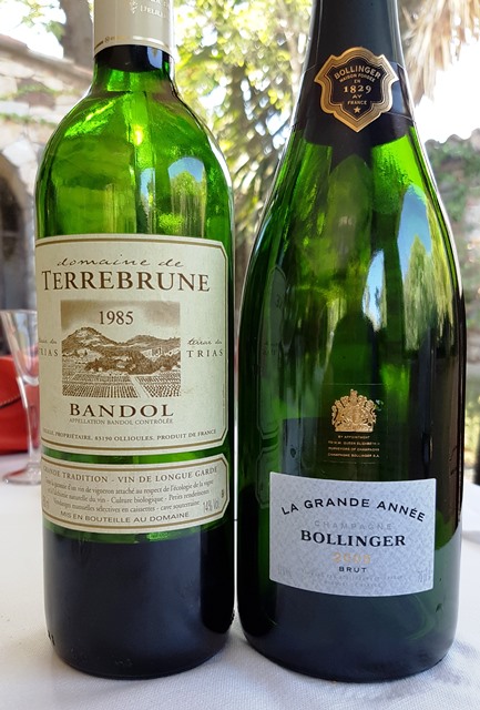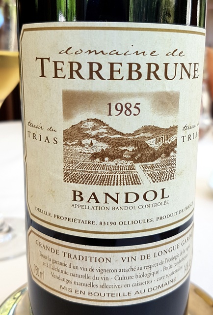 Le veau aux petites pommes de terre et à l’escalope de foie gras va accompagner un Terrebrune Bandol rouge 1985. Au premier nez j’ai tout de suite senti des accents de café et de torréfaction mais j’ai validé la bouteille. Au second nez j’ai cru à un soupçon de bouchon qui ne s’est pas confirmé par la suite. Bu seul le vin donne un petit signe de légère fatigue. Mais dès que le délicieux plat entre en scène, le vin devient vif et fringant et fait oublier la torréfaction. Notre amie n’imaginait pas qu’un Bandol de 32 ans pouvait avoir cette vivacité. Le vin est très plaisant. Pour le finir, Jean-Marc nous sert le reste du saint-nectaire que nous avions entamé lors de notre dernière visite en ce lieu. Après nous, il n’y en aura plus. Le fromage flatte bien le vin qui devient plus droit et précis. Le champagne est moins son camarade.
