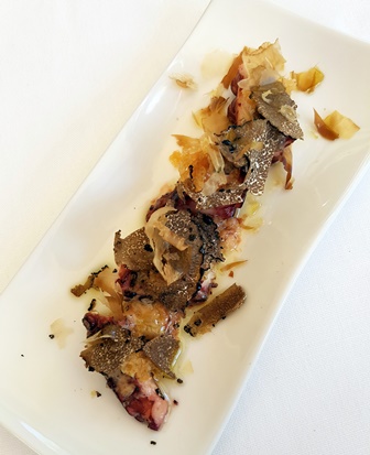 Valérie nous fait le plaisir d’ajouter au menu des petites portions de poulpes à la truffe d’été, un régal.
