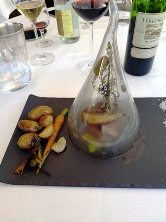Lorsque les assiettes sont enlevées, le torréfié réapparaît montrant un vin qui a dépassé les limites de sa vivacité, même s’il a été très pertinent sur le plat de veau très cohérent, avec un foie gras de grande qualité. La cuisine de Valérie Costa est fondée sur de bons produits et une recherche de cohérence que j’apprécie.
