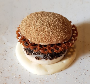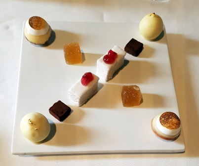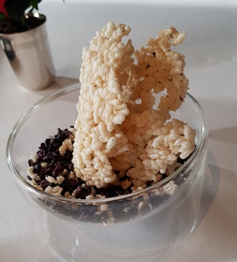 Les trois petits amuse-bouche sont délicieux. Une chips au riz soufflé est très salée. Avant de démarrer le menu, on nous apporte un autre amuse-bouche au champignon et ensuite une préparation à l’artichaut elle-même trop salée.