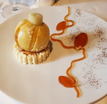 L’entrée de terrine est joliment accompagnée de betteraves très agréables, mais la croûte de la terrine est un peu lourde, ce qui est souvent le cas. C’est quand est servi le rouget qu’un sourire barre ma face, car il est goûteux et parfaitement cuit. Voilà un joli plat. Le dessert à la pomme est aussi délicieux et original.