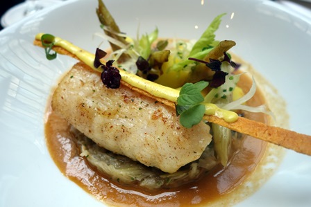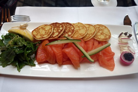 La carte est assez courte mais on dispose d’un choix possible. C’est vraiment une carte de bar. C’est assez curieux qu’un hôtel historique de cette importance ne cherche pas une restauration de plus haut niveau. Le saumon fumé aux blinis est très agréable, sans ces innombrables chichis qui torpillent le goût, et la lotte que j’ai prise a du goût, un goût sincère et vrai, et se mange avec appétit. Pour accompagner un tel repas, dans la carte des vins très courte, le plus sûr est d’aller vers les champagnes. Le Champagne Veuve Clicquot La Grande Dame Brut 2004 est un champagne solide qui ne peut pas être une mauvaise surprise. Ce champagne m’embarque dans les campagnes d’été. Je suis entourés de blés mûrs, et c’est plus la tige que les épis que je retrouve dans ce beau champagne. Je suis allongé dans la prairie, un brin de blé entre les dents, et je jouis du soleil. C’est intéressant de le voir aussi typé blé d’été. Ce champagne convivial accompagne bien les deux plats. Sans la serveuse réactive il est probable que mes yeux se seraient arrêtés sur les petits défauts. Il faudrait qu’un tel hôtel investisse dans une restauration d’un autre niveau.