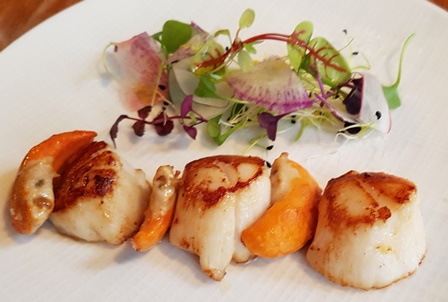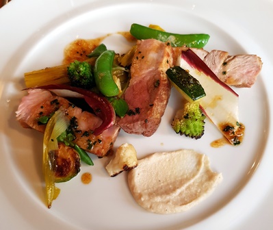 Nous trinquons avec un Champagne Delamotte Blanc de Blancs brut sans année qui est délicieux. C’est un champagne réconfortant, racé, fin, de grand plaisir. Les plats que je prendrai sont : coquilles Saint-Jacques poêlées / terrine de sanglier / échine de porc. Nous avons demandé à Hidé, le si agréable propriétaire des lieux, de simplifier les plats pour les vins, ce qu’il a fait de bonne grâce. Ainsi les coquilles étaient prévues dans une soupe. Nous l’avons écartée. Et la terrine devait être accompagnée d’une compote que nous avons refusée.