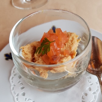 A table j’ai le temps de commander les vins et je me fais servir un Champagne Laurent- Perrier Cuvée Grand Siècle sans année dont M. Brousse me dira qu’il a dix ans de cave. Mes filles arrivent et nous trinquons avec ce beau champagne rapidement rejoint, pour chacun, par un petit pot de rillettes de poissons aux dés de saumon. Cet amuse-bouche est délicieux et avive le champagne racé, très romantique tout en ne cachant pas sa belle vinosité. Ayant l’habitude de boire ce champagne en magnum je ne retrouve pas l’opulence habituelle, mais la noblesse et le romantisme sont présents.