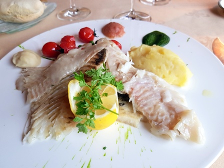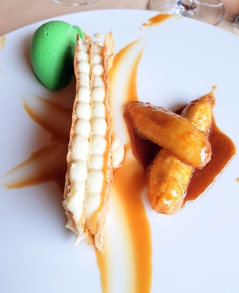 Nous passons commande et pour moi ce sera : fraîcheur de homard en habit rouge, à l’huile de pistache, concassé de tomate, mozzarella di Bufala / turbot simplement cuit / millefeuilles de banane.