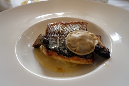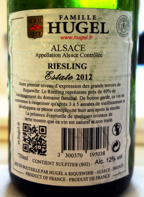 Le Riesling Estate Hugel 2012 a un peu de perlant mais il est très agréable, surtout dans le finale. Le perlant sensible ne nuit pas au finale très fruité. J’aime beaucoup le 2013 malgré sa jeunesse et le 2012 est plus fort et plus long. C’est d’ailleurs lui qui convient le mieux à la daurade.