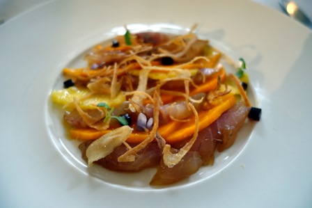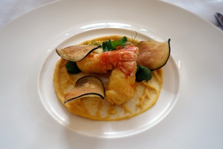 Le menu composé par le Macéo selon les indications de Mark Williamson est : tempura de langoustines bretonnes et pointe de curry, chips d’aubergine et houmous vert-pré / Céviche de daurade de ligne, mangue verte et ponzu / loup sauvage simplement braisé et beurre oncle Johnny, gnocchi maison porcini / Stilton Colston Basset, pain aux figues et noix.