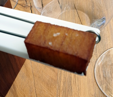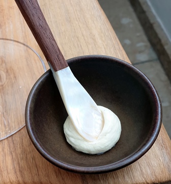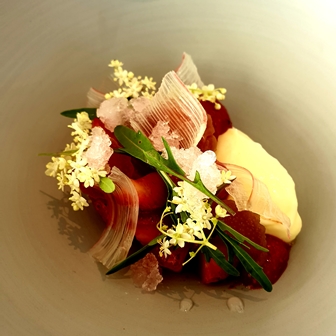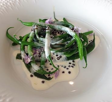 Le repas commence par le partage du pain, que l’on trempe dans une huile d’olive au citron et au gingembre qui est extrêmement gourmande et d’une persistance aromatique extrême. L’huître est une ‘numéro un’ qui trouve avec les poires une harmonie éblouissante. Le Nanakusa-No-Sekku est une tartelette avec un nombre incalculable de fleurs du jardin. La crème de petits pois est superbe. On croque les haricots verts comme si l’on était au jardin, tant ils sont frais. Tous les plats sont recouverts de jolies petites fleurs très romantiques. Le Chablis Grand cru Blanchot domaine François Raveneau 2007 est vif, cinglant, mais sait aussi être rond. Il est minéral, ce qui convient à cette cuisine florale. Il est aussi flexible.