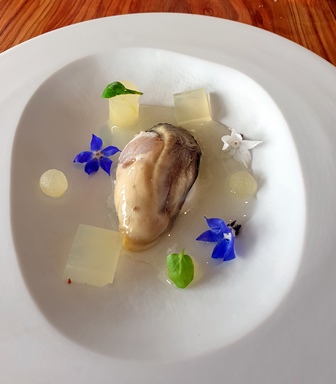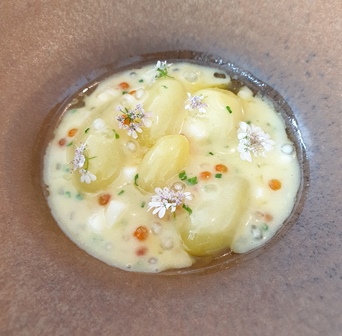 De tous les plats, tous passionnants, les deux qui émergent pour moi sont l’huître en accord avec la poire, et les petites pommes de terre avec des œufs de saumon et une sauce diabolique. Ensuite, le calamar en lamelles est très original.