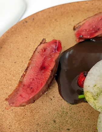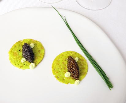 Nous prendrons le menu ‘découverte’ avec les options caviar et wagyu. Mon ami suggère de commander un champagne et ce sera un Champagne Selosse Lieu-dit la Côte Faron à Ay, dégorgé en février 2017. Le nez du champagne est incroyablement Selosse et en bouche c’est un extra-brut sans concession. Comme il est froid il est vif et rude, mais il va se domestiquer et accompagner les plats de bien belle façon. C’est avec lui que nous dégustons les amuse-bouches, mini carotte / sablé parmesan et caviar d’aubergine /champignon de Paris rose et farce de poulet / brocoli et poutargue. Ces amuse-bouches sont gracieux et intelligents, car ils ne cherchent pas à passer en force. C’est l’affirmation d’un talent serein.