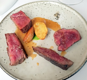 Les quatre bœufs (qui ne sont pas de mon étable) sont superbes. Dans la confrontation entre la Normande et le Simmental, c’est la Normande qui gagne, tellement équilibrée et affirmée, parlant juste. Lorsqu’il s’agit des deux wagyu, j’ai une préférence pour le poêlé qui expose généreusement son gras alors que, comme le dit mon ami, le bœuf passé sur le bincho fait cuisiné et moins naturel. Mais les quatre viandes sont excellentes et le vin d’Amérique est magnifiquement mis en valeur par les quatre. Il s’est élargi avec le temps et montre un charme plaisant.
