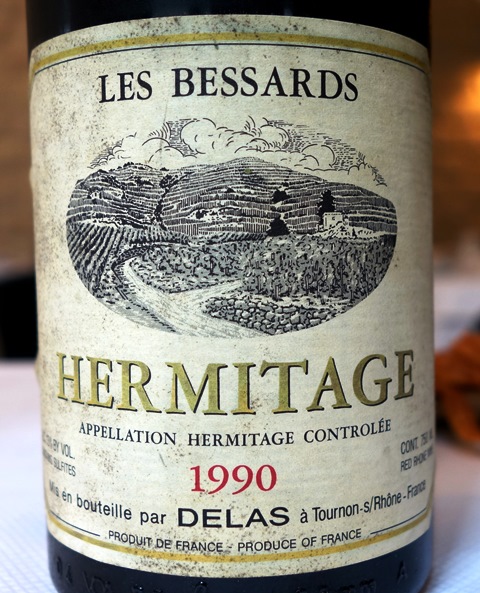 L’Hermitage Les Bessards Delas 1990 à l’ouverture a un parfum de vin tout jeune, presque de l’année, porté par une acidité juvénile. Lorsqu’il s’étend dans le verre on mesure à quel point son quart de siècle lui fait du bien. Le vin est riche, cohérent, ramassé, c’est une bombe de velours qui atteindra son acmé avec la sauce du canard de Challans. La prolongation de l’un par l’autre est spectaculaire. Le vin est riche, avec un velours qui est lourd comme du charbon. Son message est clair et direct et sa longueur est encourageante. C’est un vin de plaisir.