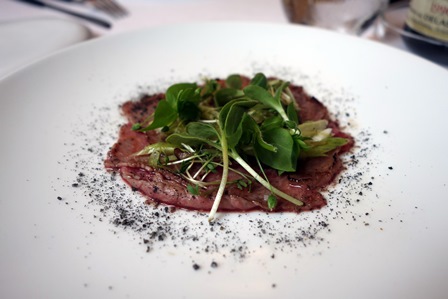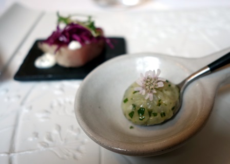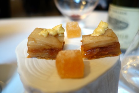 Déjeuner au restaurant Pages. Le menu découverte est ainsi composé : chips, ceviche de dorade royale, bonite / bœuf Ozaki / bar de ligne fumé / ormeau / lotte croustillante, citron caviar / canard de Challans façon Apicius / bœuf de Simmenthal 45 jours, Galice 140 jours, bœuf Ozaki, sur le Binco / coriandre, citron / Mont Blanc au Mikan.