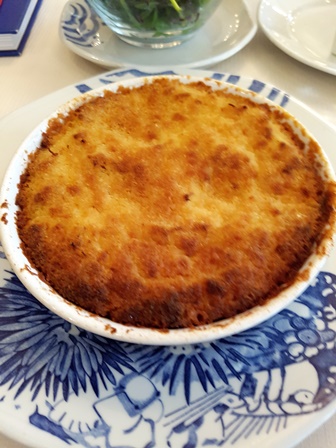 J’avais demandé au chef Eric Coisel de viriliser un peu la brandade que par tradition on prive un peu d’ail pour ne pas indisposer l’entourage de ceux qui travaillent l’après-midi. La brandade ainsi dynamisée est d’un goût que j’adore. Le champagne ne crée aucun accord particulier avec la brandade. Il s’accorde beaucoup mieux avec le soufflé.