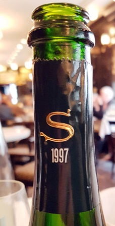 J’arrive en avance et donne un champagne que j’avais dans ma musette à rafraîchir. Le lieu me plaît toujours autant, avec ses mosaïques noires et or et une décoration de boutique presque centenaire. Mon choix de menu sera : Pappardelles de Fernando Pensato au caviar Prunier (45 grammes ) / Brandade de morue « façon Prunier » / soufflé à la Chartreuse. Le caviar est vraiment copieux et les pâtes légèrement crémées sont délicieuses. Il vaut mieux manger les pâtes et le caviar en des bouchées séparées, pour profiter de la longueur du goût délicieusement salé du caviar. Inutile de dire que sur le caviar, le Champagne Salon 1997 est mis en valeur. Ce champagne a deux qualités : vivacité et douceur. Il a en effet une très belle énergie et en même temps il a le calme souverain d’un Teddy Riner. Il a presque vingt ans et se révèle d’une magnifique maturité. C’est un grand champagne.