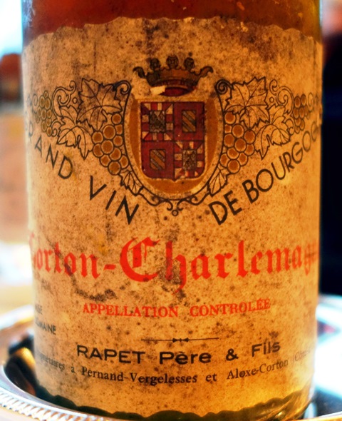 A l’ouverture, le Corton Charlemagne Rapet Père & Fils 1957 avait un manque de netteté dans son parfum, et un vigneron prudent aurait dit : « faut voir ». C’est donc avec incertitude que je porte mon nez au verre qui m’est servi. Instantanément, je sens que les odeurs incertaines ont disparu. Elles font place à un bouquet miraculeux. Il y a à la fois des fleurs de printemps, des fruits frais et des fruits confits. En bouche ce vin, dont je n’attendais rien de plus que le plaisir de la découverte, délivre une onde de complexités quasiment irréelles au point que je serais bien incapable de distinguer tous les fruits roses et rouges, jaunes et bruns qui composent sa palette. La longueur n’est pas extrême, mais la complexité immédiate transcenderait beaucoup de vins plus capés. Il n’y a pas d’évolution ou de sur maturité, il n’y a que de la joie de vivre, où les fruits innombrables se mêlent dans une profusion infinie. La coquille Saint-Jacques est très bonne, mais la crème qui l’accompagne n’est pas l’amie du vin alors que la chair seule serait divine.