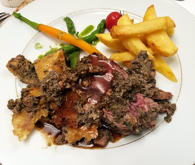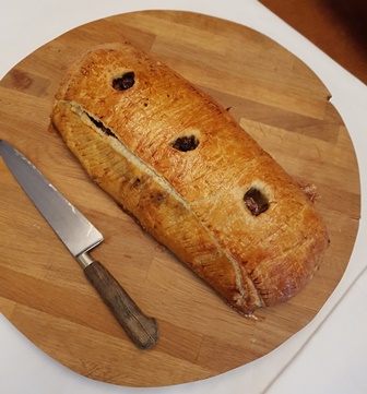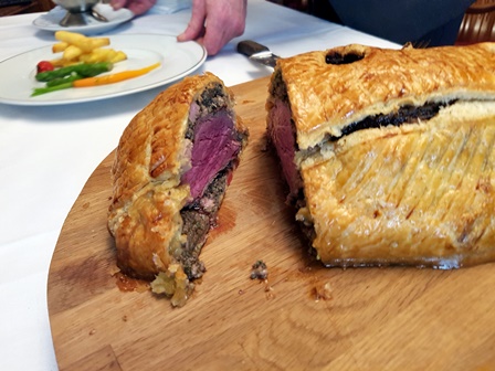 Les choses deviennent plus sérieuses sur la délicieuse viande servie avec une farce fourrée dans la croûte de cuisson. C’est la préparation en croûte et farce qui justifie l’appellation de la recette et non la victoire de Waterloo. Sur le plat, nous goûtons deux vins de 1989.
