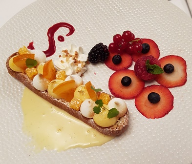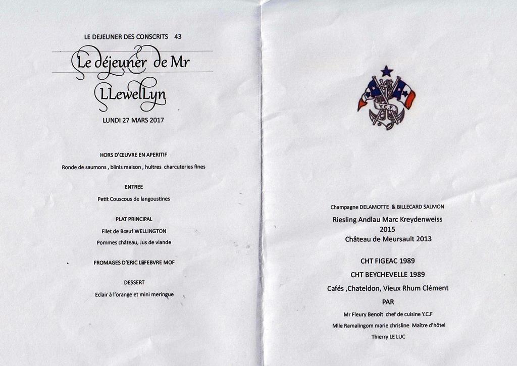Le menu composé par Thierry Le Luc et le chef Benoît Fleury est : petit couscous de langoustines / filet de bœuf Wellington, pommes château, jus de viande / fromages d’Éric Lefebvre MOF / éclair à l’orange et mini-meringue.