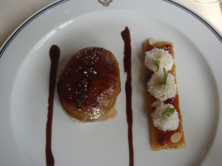 Mes amis ont pris le foie gras délicieux d’Alain Pégouret et j’ai pris des escargots pour accompagner deux vins de 1923 : le Royal Kébir, vin d’Algérie 1923 et le Vougeot les Cras Liger-Belair 1923 apportés par notre hôte. J’ai un grand amour pour ce vin d’Algérie dont j’ai acheté beaucoup d’exemplaires, et je retrouve une chaleur humaine, une générosité à peine atténuées par l’âge. Le final de ce vin est très élégant, dans des tons de framboise. Le vin de Bourgogne est animal, viande, très bourguignon. Il accuse une légère fatigue mais le message est riche d’intérêt.
